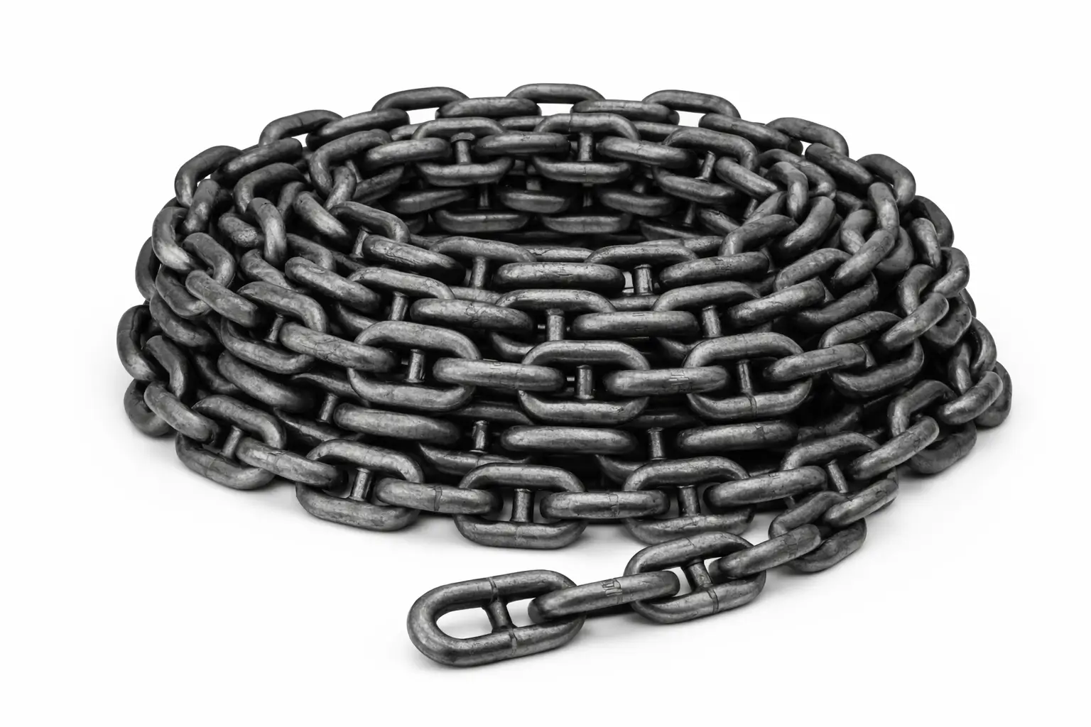 A stud link chain is a heavy-duty steel chain with a central stud welded across each link, providing increased strength and preventing deformation.