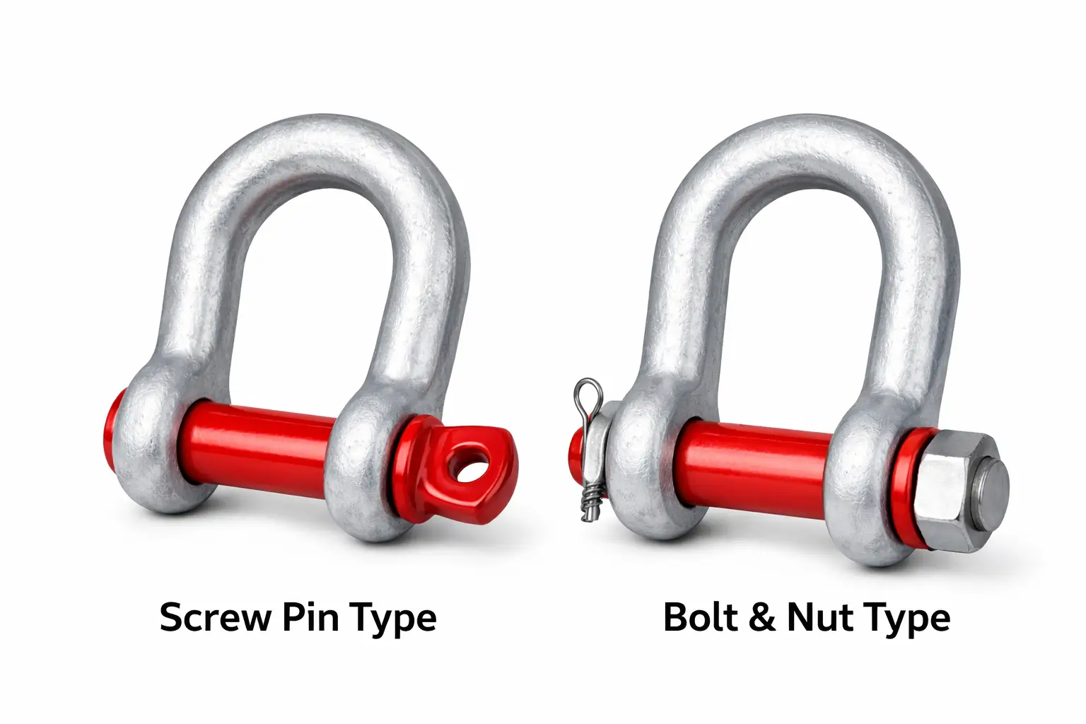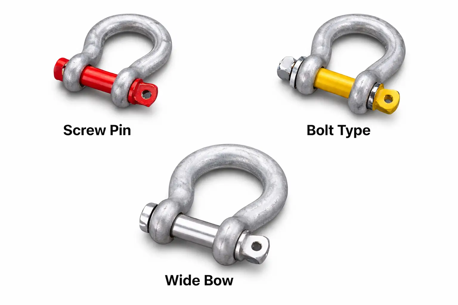 A bow shackle is a U-shaped rigging connector with a wider rounded body, designed to connect lifting slings, chains, and wire ropes.